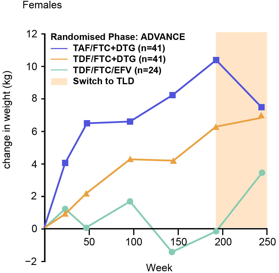 • For women switching from TAF/FTC + DTG to TDF/3TC/ DTG after Week 192, there was a statistically significant reduction in weight (median: −1.6 kg). This change in weight was not significant in men (median: −0.2 kg)