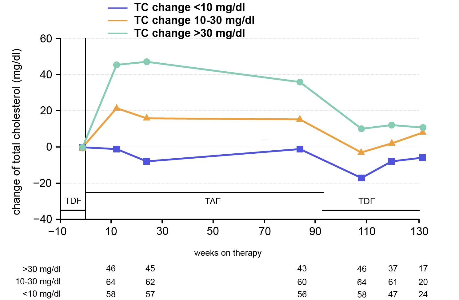 • Participants with higher increases in TC (Total Cholesterol) after switching from TDF to TAF also showed more pronounced decreases after switching back