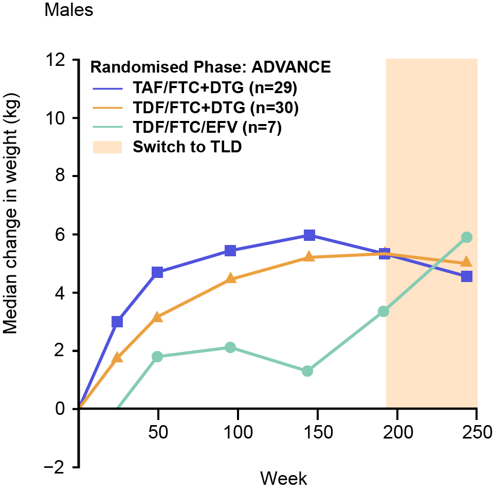 • Changes in weight and laboratory parameters during the first 192 weeks of randomised treatment and then after switch to TDF/3TC/DTG were evaluated in each treatment arm using paired non-parametric tests