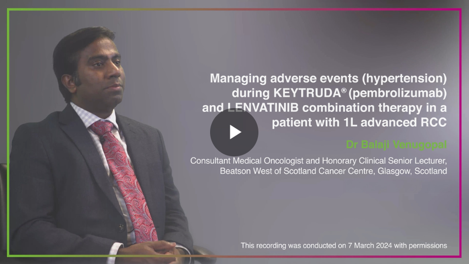 Dr Balaji Venugopal, Consultant Medical Oncologist at Beatson Cancer Centre in Glasgow, presents a case study of a 68-year-old male with advanced renal cell carcinoma, treated with KEYTRUDA in combination with LENVATINIB. This patient was diagnosed with pulmonary and adrenal nodules and was classified as IMDC intermediate risk.