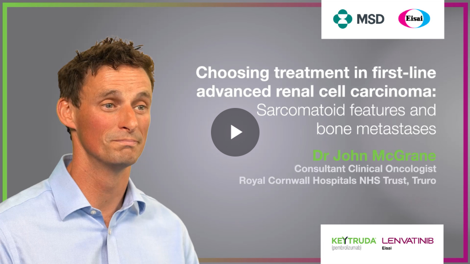 Dr John McGrane, Consultant Clinical Oncologist at the Royal Cornwall Hospitals NHS Trust in Truro presents a case study of a 62 year old male with advanced renal cell carcinoma, treated with KEYTRUDA in combination with LENVATINIB. This patient was diagnosed with sarcomatoid features and bone metastases and was classified as IMDC intermediate risk.