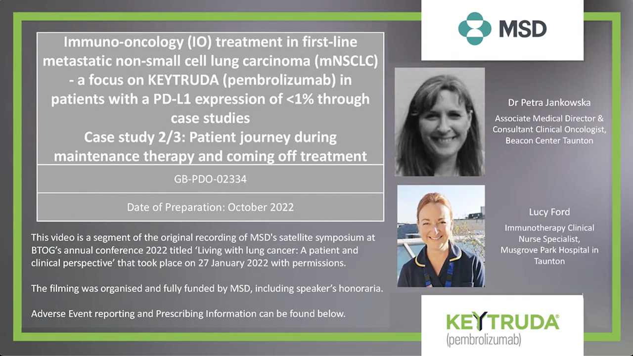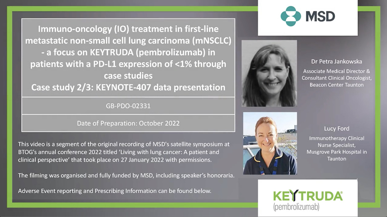 Immuno-oncology (IO) treatment in first-line metastatic non-small cell lung carcinoma (mNSCLC) – a focus on KEYTRUDA (pembrolizumab) in patients with a PD-L1 expression of <1% through case studies (Case study 2/3)