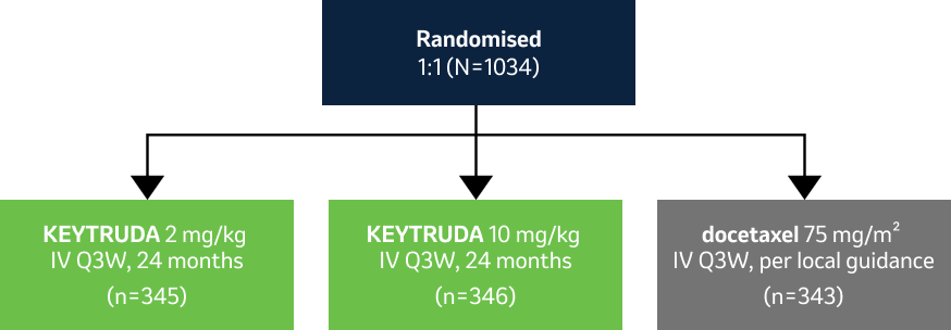 - Median OS was 10.4 months (95% CI: 9.4–11.9) with KEYTRUDA 2 mg/kg vs 8.5 months (95% CI: 7.5–9.8) with docetaxel