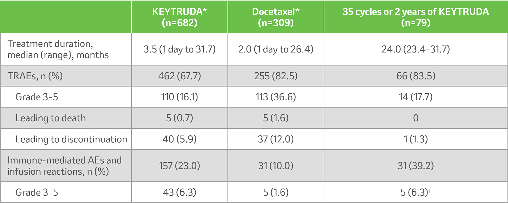 AEs reported in subjects who received KEYTRUDA, received docetaxel and completed 35 cycles or 2 years of KEYTRUDA (data cut-off date: 8 April 2020)2