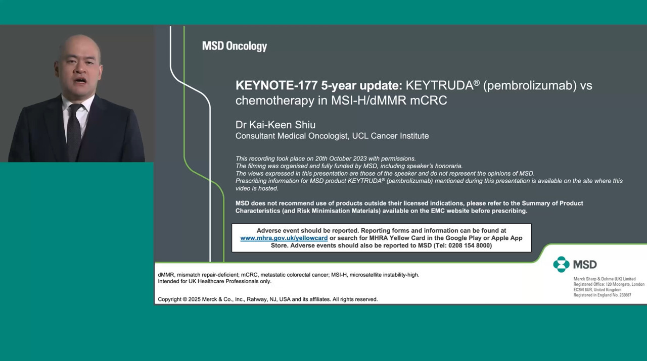 Dr. Kai-Keen Shiu, Consultant Medical Oncologist at the UCL Cancer Institute and lead investigator in the KEYNOTE-177 trial, summarises data from the 5-year follow-up of the Phase III trial for patients with advanced MSI-H/dMMR mCRC.1