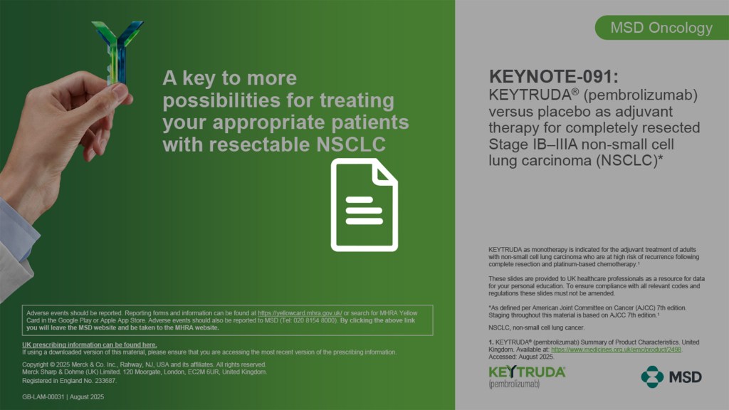 Please refer to the KEYTRUDA Summary of Product Characteristics and Risk Minimisation Materials before prescribing KEYTRUDA. Risk Minimisation Materials are available online, from your MSD representative or from MSD Medical Information (Email: medicalinformationuk@msd.com, Phone: 0208 154 8000).